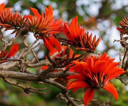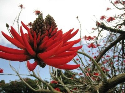 ブラジル南東部原産のマメ科デイゴ属の落葉小高木です。高さは5mくらいで、枝をいっぱいに広げます。幹や枝に大型のトゲがあります。花は落葉期の3月下旬~4月に、新芽に先がけて枝先に開花します。長さ10㎝ほどの刀の鞘のような尖った筒状の花が房状にまとまって咲きます。デイゴと異なり、花序が上向きにまとまって咲きます。花色は鮮やかな赤色、個々の花弁は開花する際に開かず筒状のままで、下から上に向かって咲いてきます。和名をサイハイデイゴ(采配デイゴ)