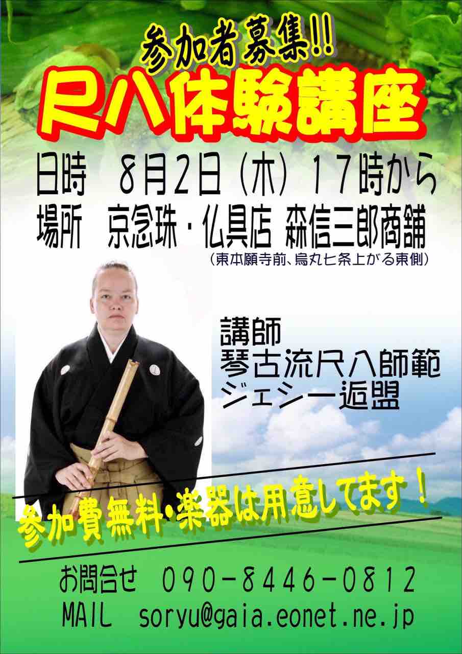 8月2日(木)、17時から、東本願寺向かい(烏丸七条上がる東側)京念珠・仏具店 森信三郎商舗にて、尺八無料体験教室を行います。