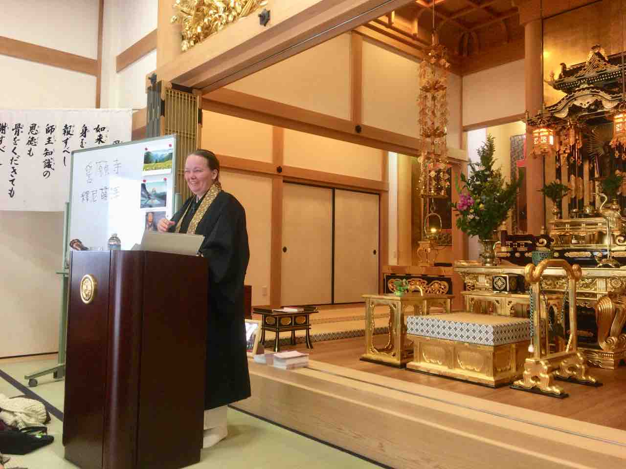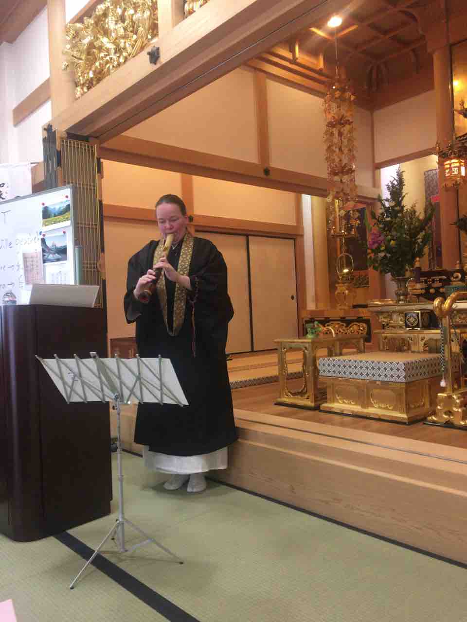 本日は、大阪市東淀川区にある真宗大谷派・教應寺にご縁を頂いて、60分の話しと、尺八演奏させて頂きました。住職さんに貴重な機会を頂いて、本当に感謝しています。「自分の命は誰のものか」老いていくことへの不安、私達皆に関係しているテーマですね。母親の安楽死の話しは、皆の心に響くように感じています。私にとってもまだまだ辛いところありますが、皆に聞いて頂いて、本当によかったと思います。話しが終わった後は沢山の方が感動の気持ちを伝えに、手を握りに来て下さいました。若葉マークの尼僧である私にとっては、言葉で言い表せない気持ちです。