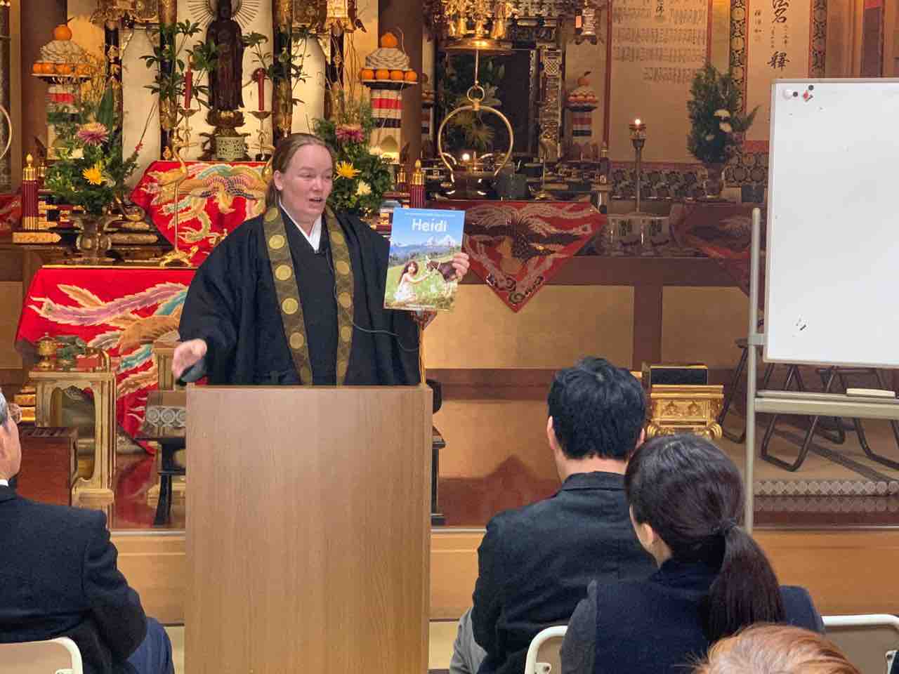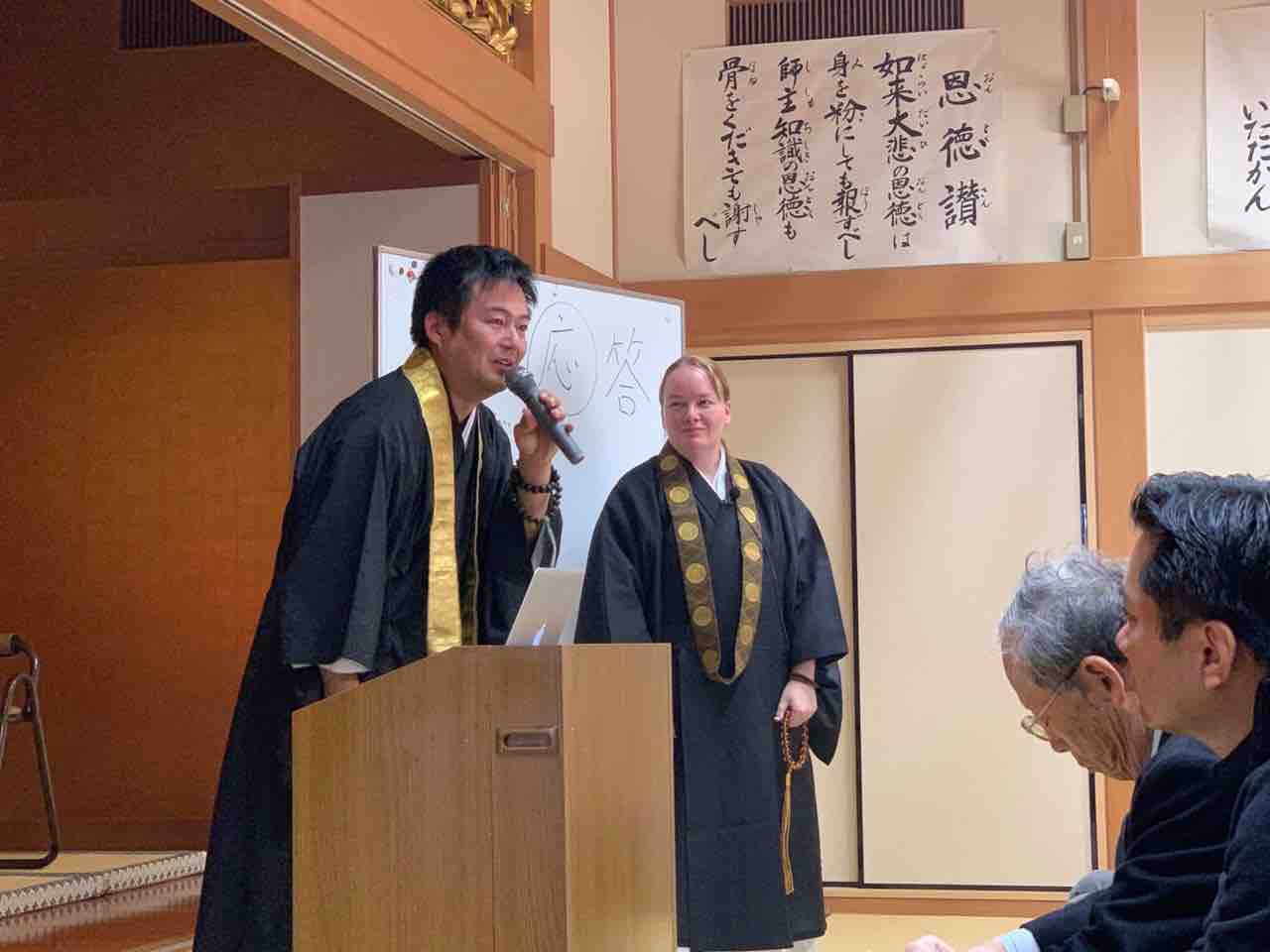 今日は高善寺にご縁頂いて、誓願寺の住職と二人で報恩講を伺いました。高善寺の住職は女性であること、本当に嬉しかったです。出仕させて頂いた後、法話の前半を、私は「いのちは誰のものか」について話をさせて頂き、後半は誓願寺の住職と対談の形で、法話によく使われている言葉や、難しい専門用語を、日常使用する単語で分かりやすく説明して頂きました。「往生は、具体的に何を示していますか」、「お念仏だけでいい、をどのように頂けば良いか」、「本願の意味は何ですか」、、、など、今更お寺さんに聞けない質問を、門徒さんと一緒に考える有意義な時間になりました。法話によく使われている表現を理解できなかったら、僧侶のお話について行くことは更に難しくなるでしょう。今日は浜口先生のご説明で色々と勉強になりました。