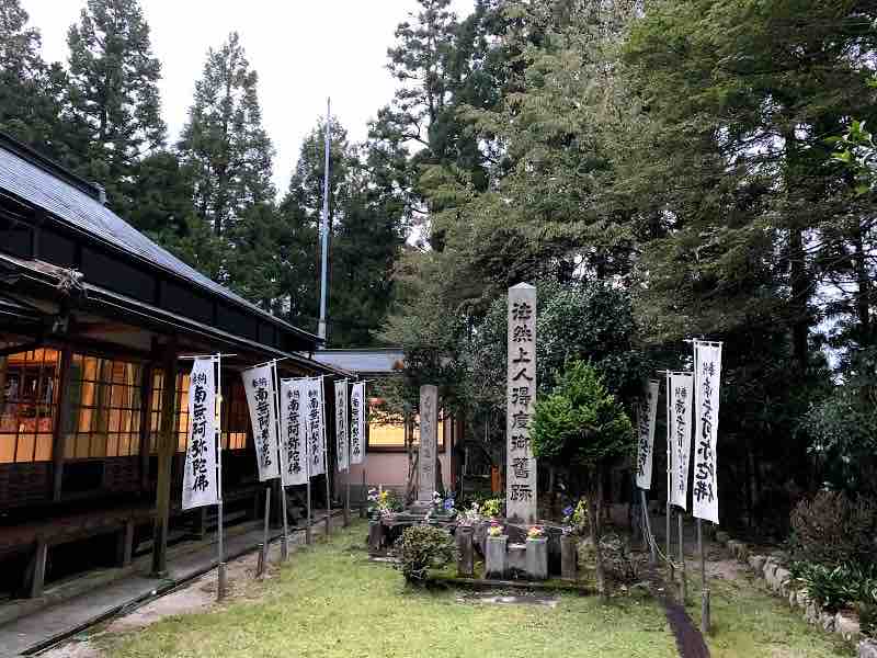 昼間の写真、この地は、法然上人が15歳の時に剃髪得度をされた場所となります。