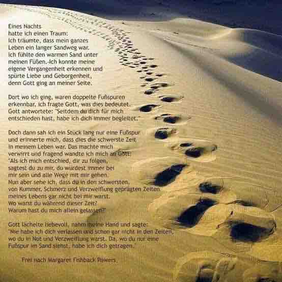 「神よ、私があなたに従って生きると決めたとき、あなたはずっと私とともに歩いてくださるとおっしゃられた。しかし、私の人生のもっとも困難なときには、いつもひとりの足跡しか残っていないではありませんか。私が一番にあなたを必要としたときに、なぜあなたは私を見捨てられたのですか」